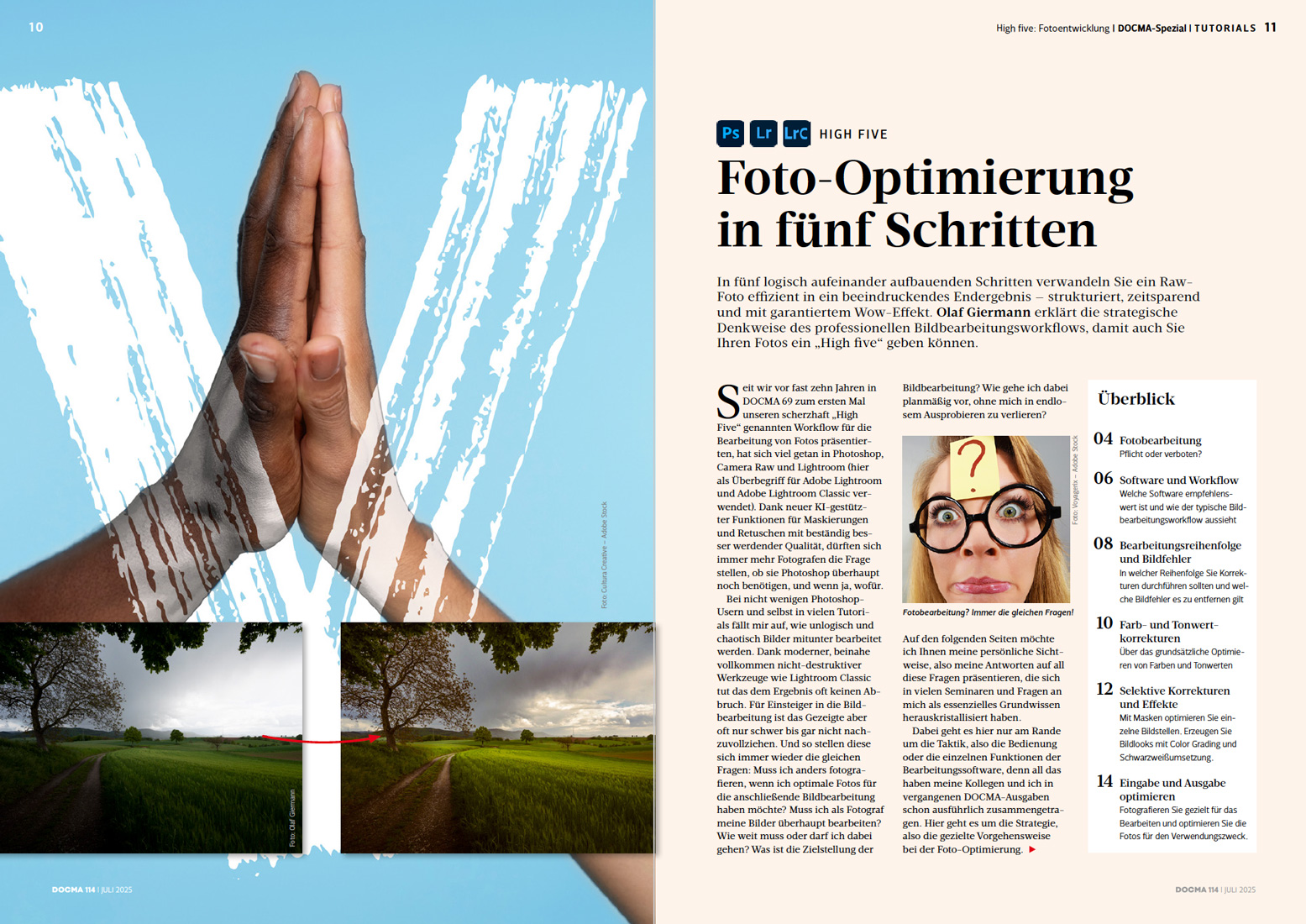• Foto-Optimierung in fünf Schritten  Olaf Giermann erklärt die strategische Denkweise, die im Foto-Workflow in fünf logisch aufeinander aufbauenden Schritten zu den optimalen Ergebnissen führt.