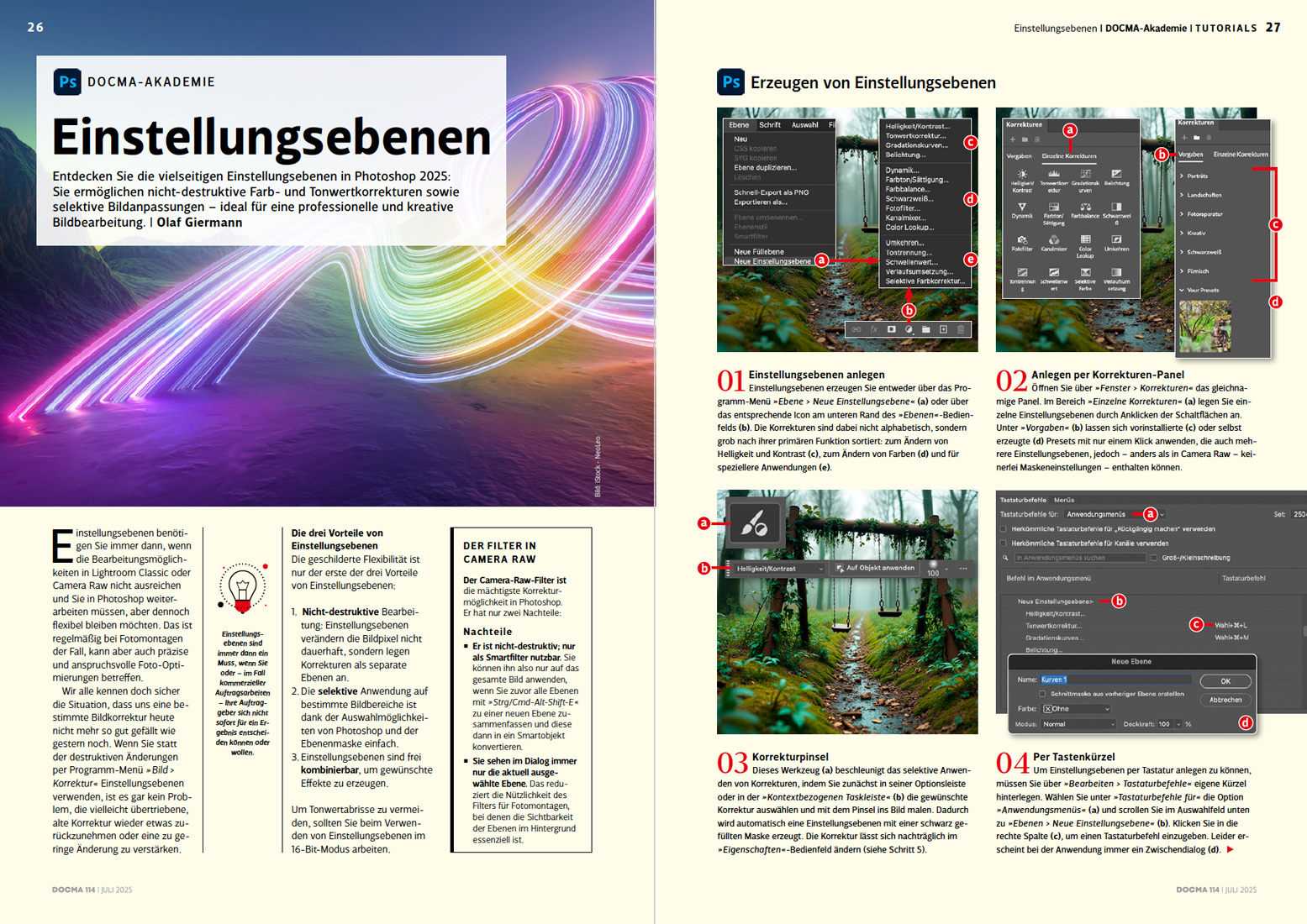 • Einstellungsebenen  In der DOCMA-Akademie geht es diesmal um Einstellungsebenen. Sie ermöglichen nicht-destruktive Farb- und Tonwertkorrekturen sowie selektive Bildanpassungen.