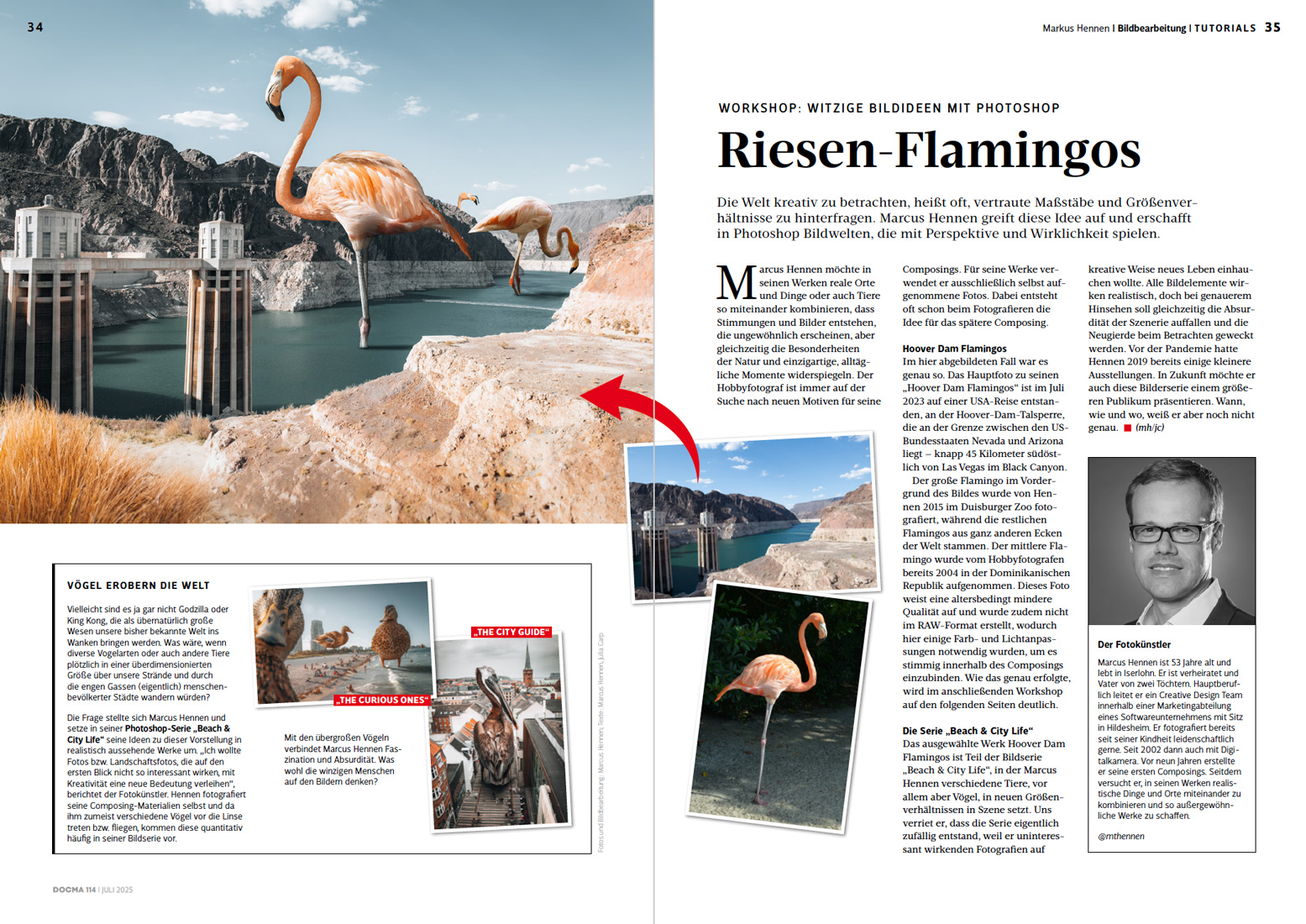 • Riesen-Flamingos  Marcus Hennen erschafft Bildwelten, in denen übergroße Vögel Strände und Städtebevölkern. In einem kurzen Tutorial zeigt er, wie er bei der Fotomontage vorgeht.