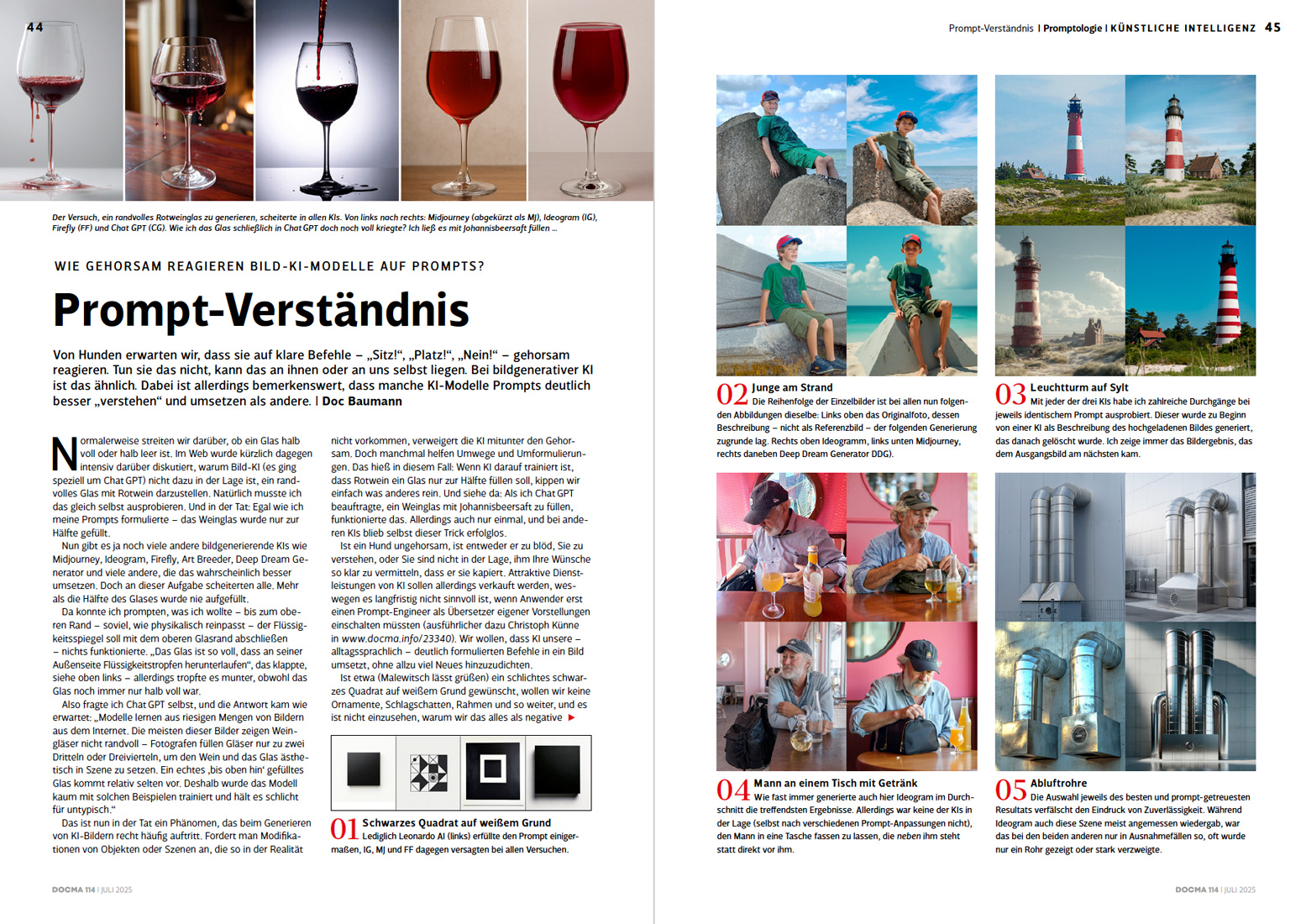 • Prompt-Verständnis  Doc Baumann hat ausprobiert, wie gehorsam die Bild-KI-Modelle Midjourney, Ideogram, Firefly, Leonardo AI, Deep Dream Generator und ChatGPT auf Prompts reagieren. Dabei stellte sich heraus, dass manche die Anweisungen deutlich besser verstehen als andere.