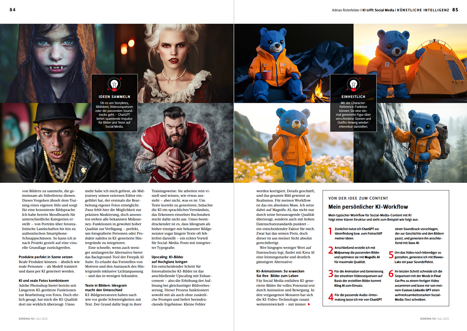 • Eine Chance für   Fotografen  Adrian Rohnfelder sieht generative KI nicht als Bedrohung, sondern als lohnendes Betätigungsfeld für Kreative, und stellt seine Lieblingstools für Social-Media-Anwendungen vor.
