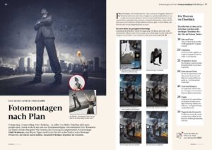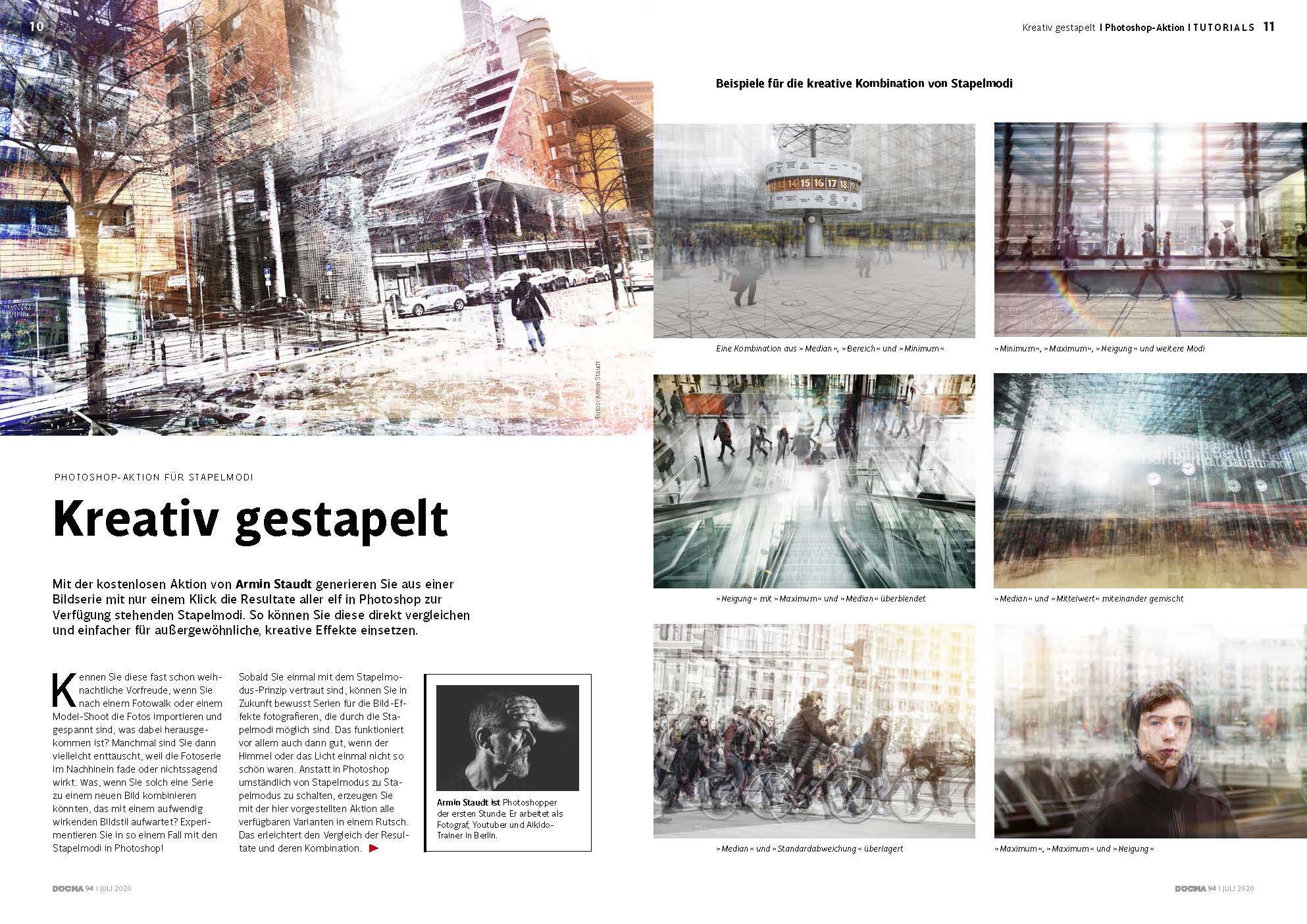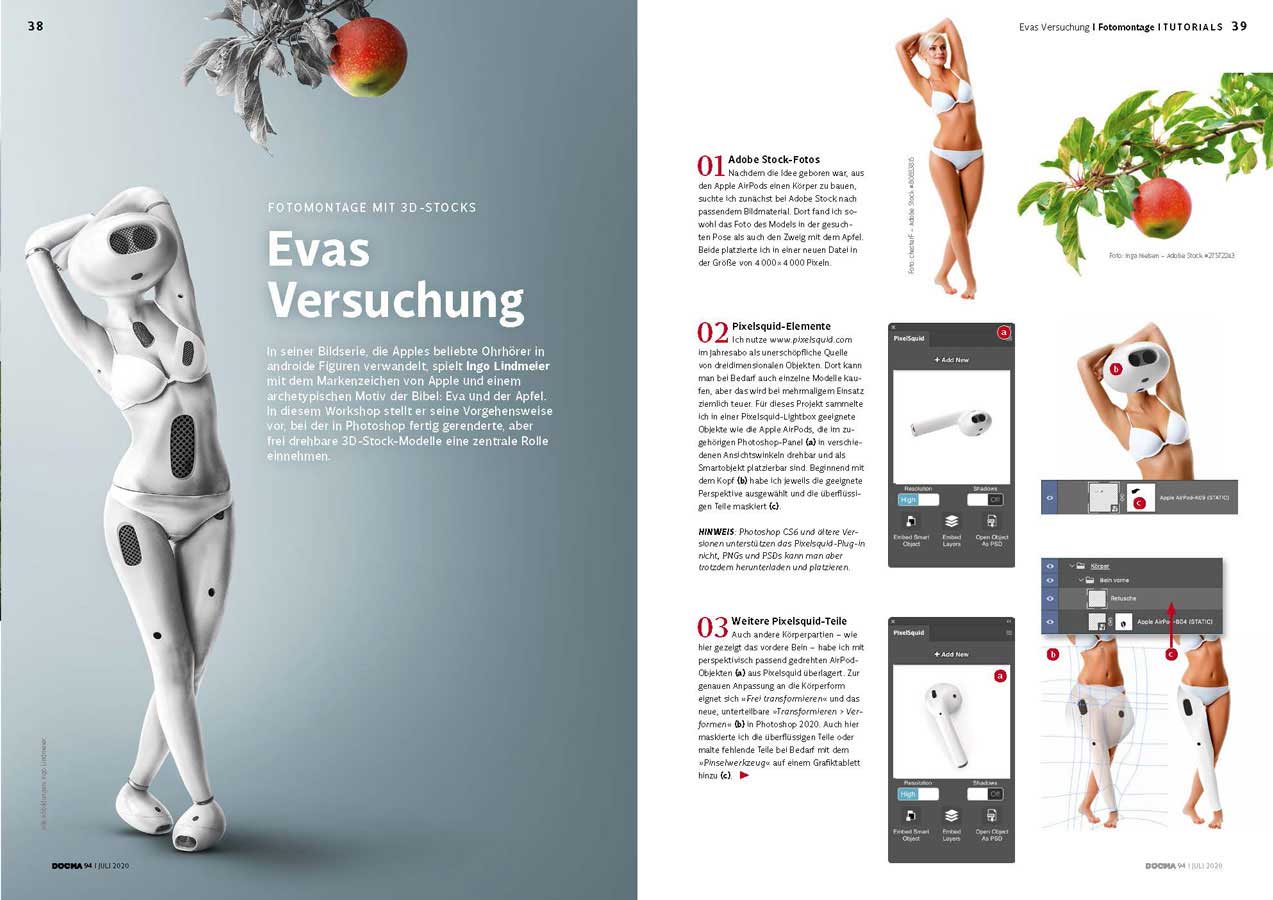 Kreativ gestapelt Mit der kostenlosen Aktion von Armin Staudt generieren Sie automatisch aus einer Bildserie die Resultate aller elf Stapelmodi von Photoshop. Fotomontagen nach Plan Im Premiumworkshop geht es diesmal um das Zusammenfügen verschiedener Elemente zu einem neuen Bild. Wir zeigen Ihnen Tipps und Tricks für die sechs Stufen jedes Montage-Prozesses. Neuer Himmel mit KI In Luminar 4 tauschen Sie ohne Maskierungsarbeit mit der auf künstlicher Intelligenz beruhenden Funktion „AI Sky Replacement“ den Himmel in einem Bild aus. Evas Versuchung In seiner Bildserie, die Apples Ohrhörer in androide Figuren verwandelt, spielt Ingo Lindmeier mit dem Markenzeichen von Apple und dem archetypischen Motiv der Bibel: Eva und der Apfel. DOCMA hilft: Parallele Linien Parallele Linien und Werkzeugspuren lassen sich in Photoshop auf unterschiedliche Weise gestalten. Doc Baumann erklärt, wie das geht. Bildtiefe per Parallax-Effekt Wie Sie in Photoshop die Betrachtung einer Szene aus unterschiedlichen Blickwinkeln simulieren. Raumtiefe durch Bewegung In diesem Tutorial zeigen wir Ihnen, wie Sie einem zweidimensionalen Foto räumliche Tiefe verleihen und ein Animationsvideo erzeugen. DOCMA-Akademie: Pimp your landscape Hier erfahren Sie, wie Sie Ihre Landschaftsbilder mit Lightroom optimieren und Belichtungsmängel ausgleichen. Experimente mit einem Ringlicht Die Kombination eines Dauer-Ringlichts mit Systemblitzen ergibt eine mitunter sehr effektvolle Porträtbeleuchtung. DOCMA-Akademie: Raw-Konverter als Filter Die Vor- und Nachteile des Camera-Raw- Filters und die Möglichkeiten von Affinity Photo und Luminar. Panoramen zusammenfügen Panoramen mit Lightroom, Photoshop und Affinity Photo stitchen. Anpassungen über „Gleiche Farbe“ Was Sie beim Übertragen der Farbgebung eines Bildes auf ein anderes beachten sollten. Unterwasser-Effekt Bartosch Matthias Kaletha erläutert, wie er seine virtuellen Unterwasserbilder in Photoshop zusammensetzt. Die im Dunkeln sieht man doch In einer neuen Serie nehmen wir uns problematischer Raw-Dateien an und schlagen Lösungen vor. DOCMA hilft: Oberfläche rekonstruieren Doc Baumann und Olaf Giermann zeigen ihre jeweilige Herangehensweise an ein Retuscheproblem.