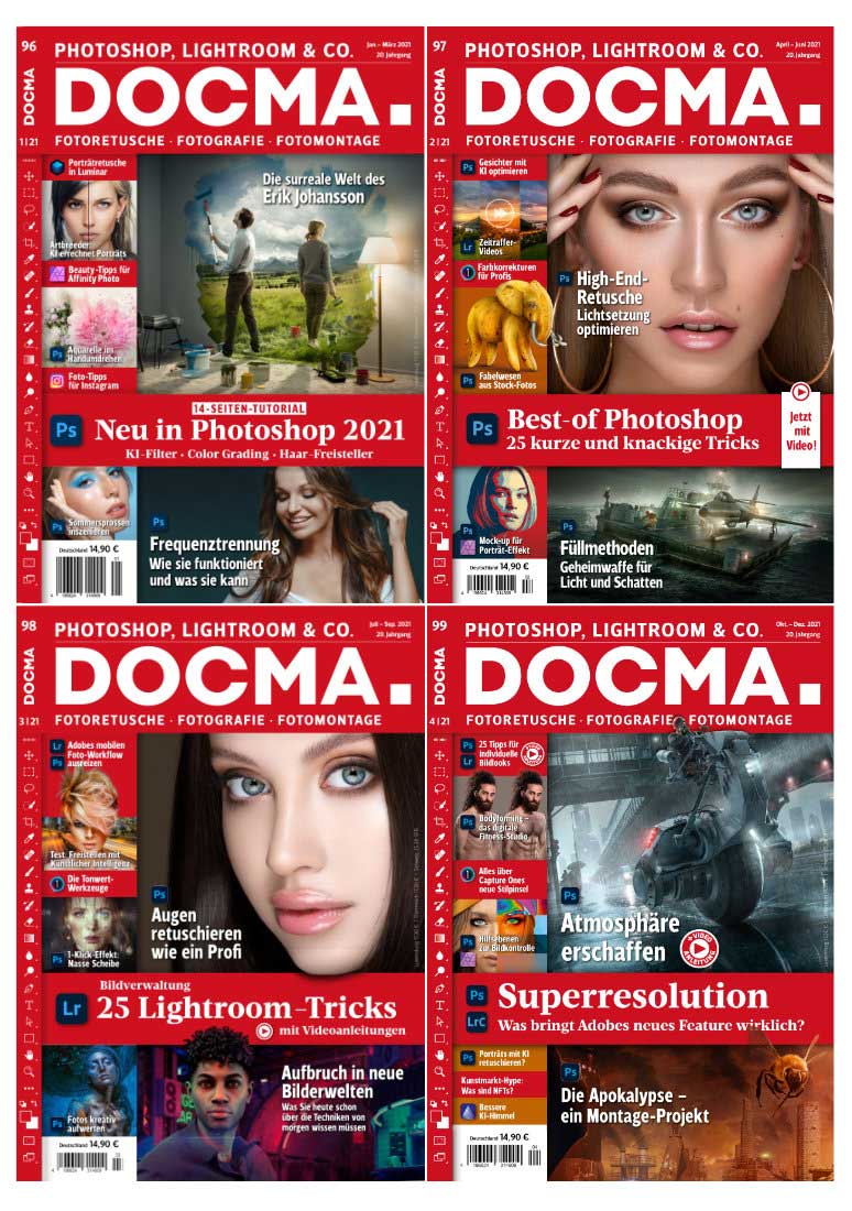 Die DOCMA-Ausgaben des Jahres 2021: Über 500 Seiten Bildbearbeitungskompetenz für Photoshop und Lightroom & Co.