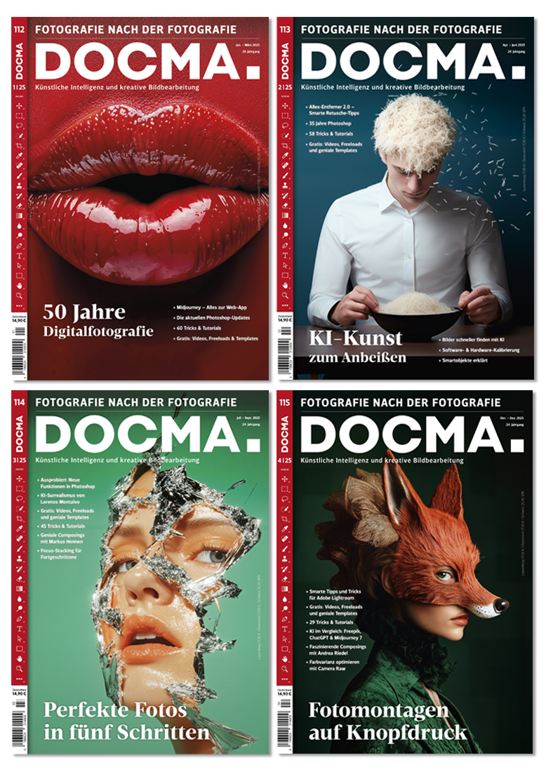 Die vier DOCMA-Ausgaben des Jahres 2025: 400 Seiten mit allem, was Sie über die aktuellen KI-Tools für Bild- und Videogenerierung und die Bildbearbeitung mit Photoshop, Lightroom & Co. wissen sollten.