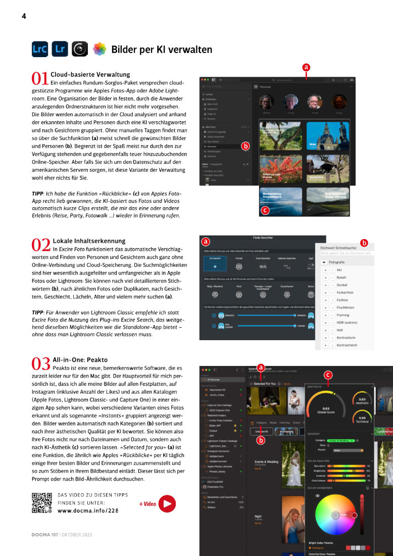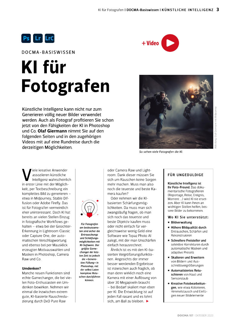 Künstliche Intelligenz kann nicht nur zum Generieren völlig neuer Bilder verwendet werden. Auch als Fotograf profitieren Sie auf vielfältige Weise von den Fähigkeiten der KI in Photoshop & Co. Olaf Giermann erläutert in einem 15-seitigen ePaper und in 12 leichtverständlichen Video-Anleitungen, welche Möglichkeiten die KI-Funktionen bieten und wie sich damit die Qualität Ihrer Fotografien entscheidend verbessern. Der Beitrag wurde veröffentlicht in DOCMA #107 und im Buch „Promptologie 2 – Generative Bild-KI in der Praxis„.