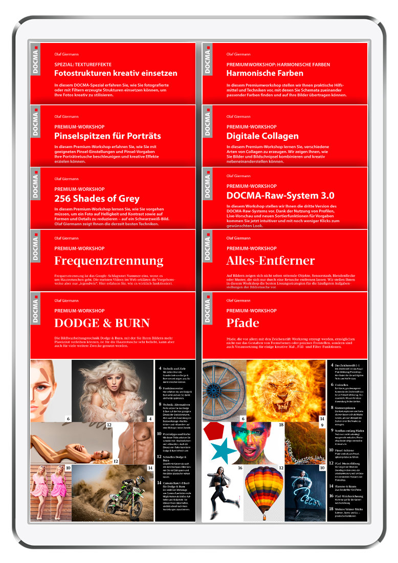 Hyperrealismus | Eigen Looks für Ihre Bilder finden | Einfach freistellen | Quick-Composings | Hautretusche | Fotos kreativ optimieren | Weniger ist mehr – gezielt Bildbeschnitte wählen | RAW Spezial – Entwickeln mit System | Reise Spezial – Gezielt fotografieren und optimieren | Gute Bilder trotz schlechten Lichts.