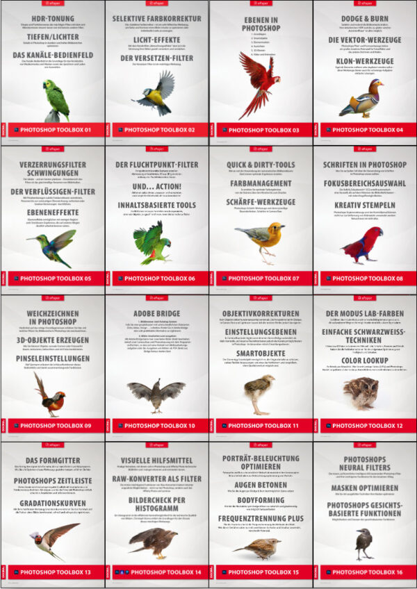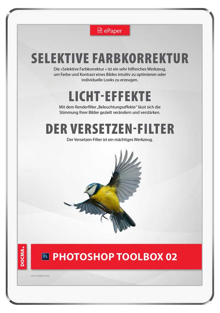 Photoshop Toolbox 02SELEKTIVE FARBKORREKTUR: Mit dem globalen Werkzeug „Selektive Farbkorrektur“ lässt sich die Farbgebung Ihrer Bilder besonders fein abstufen und anpassen. | LICHT-EFFEKTE: Mit dem Renderfilter „Beleuchtungseffekte“ lässt sich die Stimmung Ihrer Bilder gezielt verändern und verstärken. | DER VERSETZEN-FILTER: So funktioniert der Versetzen-Filter. Wie Sie mit seiner Hilfe magische Bildergebnisse erzielen. | ePaper, 21 Seiten | TOB002 |