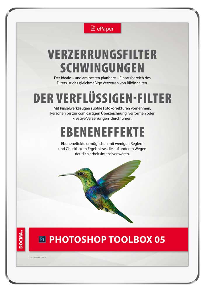 Photoshop Toolbox 05VERZERRUNGSFILTER SCHWINGUNGEN: Der ideale – und am besten planbare – Einsatzbereich des Filters ist das gleichmäßige Verzerren von Bildinhalten. | DER VERFLÜSSIGEN-FILTER: Das Verflüssigen-Werkzeug birgt nicht nur für die Beautyretusche und das Bodyforming fantastisches kreatives Potenzial. | EBENENEFFEKTE: Ebeneneffekte ermöglichen mit wenigen Reglern und Checkboxen Ergebnisse, die auf anderen Wegen deutlich arbeitsintensiver wären. | ePaper, 22 Seiten| TOB005 |