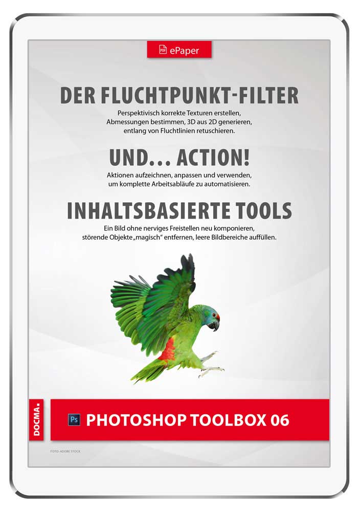Photoshop Toolbox 06DER FLUCHTPUNKT-FILTER: Perspektivisch korrekte Texturen erstellen, Abmessungen bestimmen, 3D aus 2D generieren, entlang von Fluchtlinien retuschieren. | UND… ACTION!: Aktionen aufzeichnen, anpassen und verwenden, um komplette Arbeitsabläufe zu automatisieren. | INHALTSBASIERTE TOOLS: Ein Bild ohne nerviges Freistellen neu komponieren, störende Objekte „magisch“ entfernen, leere Bildbereiche auffüllen. | ePaper, 20 Seiten | TOB006 |
