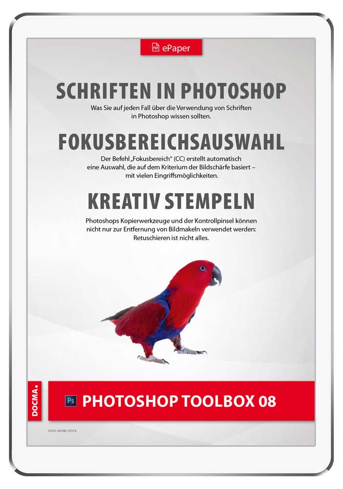 Photoshop Toolbox 08SCHRIFTEN IN PHOTOSHOP: Was Sie auf jeden Fall über die Verwendung von Schriften in Photoshop wissen sollten. | FOKUSBEREICHSAUWAHL: Der Befehl „Fokusbereich“ (CC) erstellt automatisch eine Auswahl, die auf dem Kriterium der Bildschärfe basiert – mit vielen Eingriffsmöglichkeiten. | KREATIV STEMPELN: Photoshops Kopierwerkzeuge und der Kontrollpinsel können nicht nur zur Entfernung von Bildmakeln verwendet werden: Retuschieren ist nicht alles. | ePaper, 18 Seiten | TOB008 |