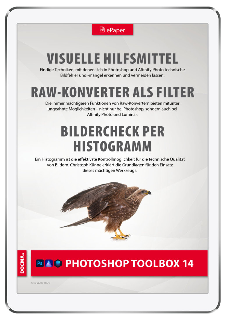 Photoshop Toolbox 14VISUELLE HILFSMITTEL: Findige Techniken mit denen sich in Photoshop und Affinity Photo technische Bildfehler und -mängel erkennen und vermeiden lassen. | RAW-KONVERTER ALS FILTER: Die immer mächtigeren Funktionen von Raw-Konvertern bieten mitunter ungeahnte Möglichkeiten – nicht nur bei Photoshop, sondern auch bei Affinity Photo und Luminar. | BILDERCHECK PER HISTOGRAMM: Ein Histogramm ist die effektivste Kontrollmöglichkeit für die technische Qualität von Bildern. Christoph Künne erklärt die Grundlagen für den Einsatz dieses mächtigen Werkzeugs. | ePaper, 22 Seiten | TOB014 |