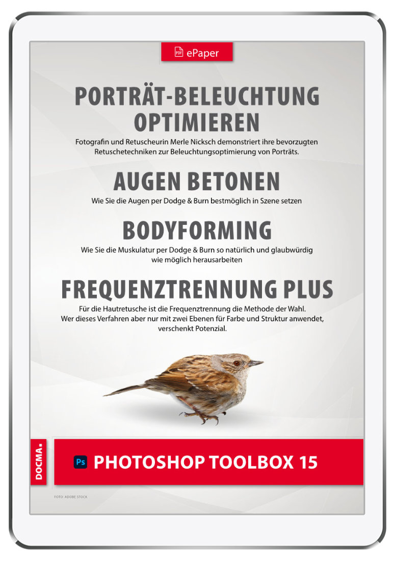 Photoshop Toolbox 15PORTRÄT-BELEUCHTUNG OPTIMIEREN: Fotografin und Retuscheurin Merle Nicksch demonstriert ihre bevorzugten Retuschetechniken zur Beleuchtungsoptimierung von Porträts. | AUGEN BETONEN: Wie Sie die Augen per Dodge und Burn bestmöglich in Szene zu setzen. | BODYFORMINF: Wie Sie die Muskulatur per Dodge und Burn so natürlich und glaubwürdig wie möglich herausarbeiten. | FREQUENZTRENNUNG PLUS: Für die Hautretusche ist die Frequenztrennung die Methode der Wahl. Wer dieses Verfahren aber nur mit zwei Ebenen für Farbe und Struktur anwendet, verschenkt Potenzial. | ePaper, 19 Seiten | TOB015 |