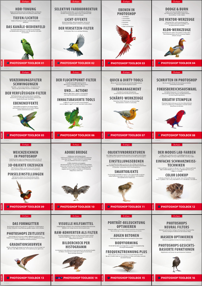 Photoshop Toolbox 01HDR-TONUNG: Einsatz und Funktionsweise des mächtigen Filters mit dem sich Mikrokontrastesteuern lassen wie mit keinem anderer Filter. | TIEFEN/LICHTER: Details in Photoshop in dunklen und hellen Bildbereichen optimieren. | DAS KANÄLE-BEDIENFELD: Das Kanäle-Bedienfeld ist die Grundlage für das Verständnis von Maskiermodus und Masken sowie das Speichern und Laden von Auswahlen. | ePaper, 19 Seiten | TOB001 |