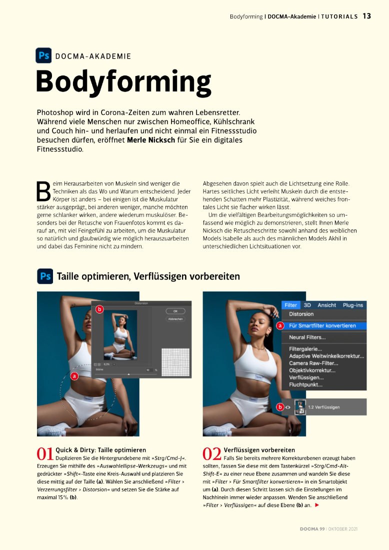 Beim Bodyforming kommt es darauf an, die Muskulatur per Dodge und Burn so natürlich und glaubwürdig wie möglich herausarbeiten. Merle Nicksch stellt die Retuscheschritte im Kapitel „Bodyforming“ daher sowohl anhand eines weiblichen, als auch eines männlichen Models in unterschiedlichen Lichtsituationen vor.