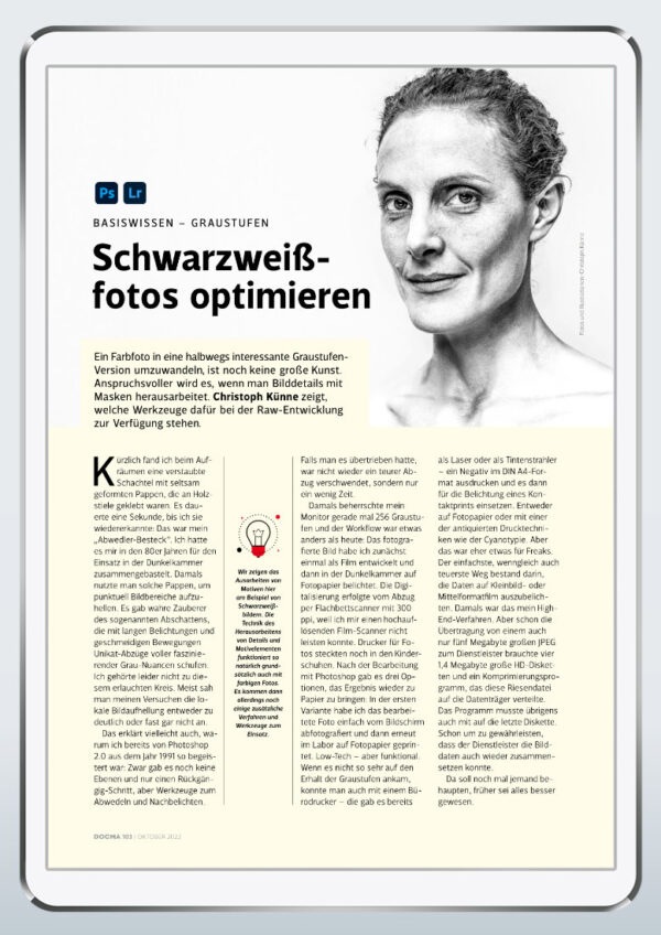 Ein Farbfoto in eine halbwegs interessante Graustufen-Version umzuwandeln, ist noch keine große Kunst. Anspruchsvoller wird es, wenn man Bilddetails mit Masken herausarbeitet. Christoph Künne zeigt, welche Werkzeuge dafür bei der Raw-Entwicklung zur Verfügung stehen. ePaper, 8 Seiten. Artikel aus > DOCMA Nr. 103.