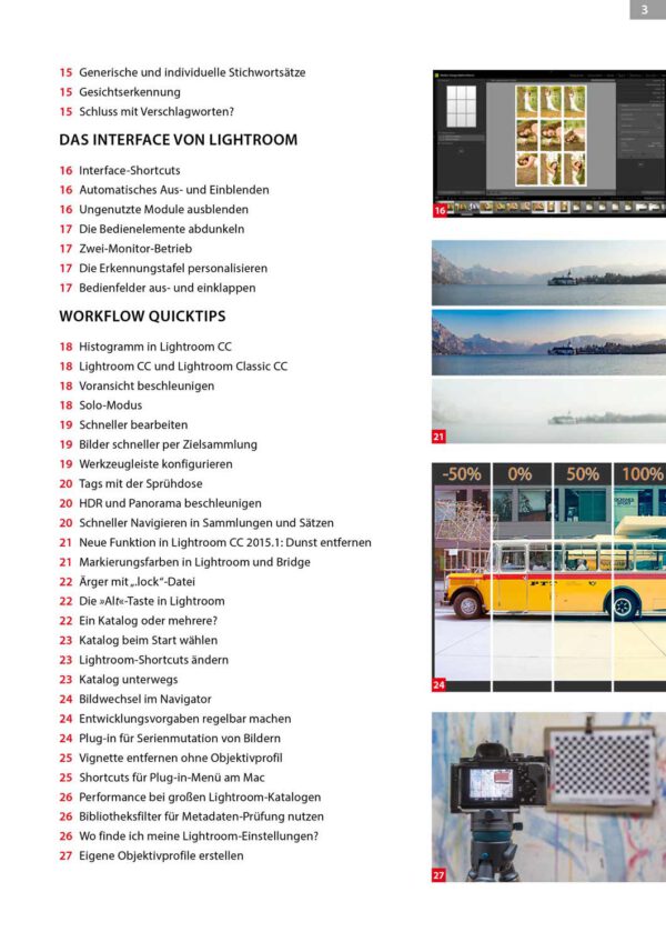 MIT LIGHTROOM-VORGABEN ZEIT SPAREN: Workflow-Vorgaben | Benennung von Vorgaben | Stichwortsatz | Dateinamen-Umbenennung | Vorgaben anpassen | LIGHTROOM-VORGABEN: Presets konvertieren | Rollover-Vorschau | Teil-Presets | The Fader-Plug-in | WEISSABGLEICH IN LIGHTROOM: ColorChecker Passport | Tipps zur Pipette | Per Stichwort zur Referenzaufnahme | ColorChecker Passport-Profile | Schatten | Weißabgleich schwarzweiß | LIGHTROOM (CLASSIC) BIBLIOTHEK: Miniaturgröße ändern | Ansichtsoptionen | Die drei Rasteransichten | Vergrößerte Bildansicht | Informationen im Bild einblenden | Fotos vergleichen | EXPORT AUS LIGHTROOM: Export mit Vorgaben | Veröffentlichungsdienst statt Export | Nachbearbeitung | Mit gleichen Einstellungen exportieren | Drucken statt exportieren | Export in die Dropbox | Per E-Mail versenden | BILDER TAGGEN UND FINDEN: Nach Stichwörtern suchen | Wichtig: Stichwort-Hierarchien | Schnell und umfangreich verschlagworten | Generische und individuelle Stichwortsätze | Gesichtserkennung | Schluss mit Verschlagworten? | DAS INTERFACE VON LIGHTROOM: Interface-Shortcuts | Automatisches Aus- und Einblenden | Ungenutzte Module ausblenden | Die Bedienelemente abdunkeln | Zwei-Monitor-Betrieb | Die Erkennungstafel personalisieren | Bedienfelder aus- und einklappen | WORKFLOW QUICKTIPS: Histogramm in Lightroom CC | Lightroom CC und Lightroom Classic CC | Voransicht beschleunigen | Solo-Modus | Schneller bearbeiten | Bilder schneller per Zielsammlung | Werkzeugleiste konfigurieren | Tags mit der Sprühdose | HDR und Panorama beschleunigen | Schneller Navigieren in Sammlungen und Sätzen | Neue Funktion in Lightroom CC 2015.1: Dunst entfernen | Markierungsfarben in Lightroom und Bridge | Ärger mit „.lock“-Datei | Die »Alt«-Taste in Lightroom | Ein Katalog oder mehrere? | Katalog beim Start wählen | Lightroom-Shortcuts ändern | Katalog unterwegs | Bildwechsel im Navigator | Entwicklungsvorgaben regelbar machen | Plug-in für Serienmutation von Bildern | Vignette entfernen ohne Objektivprofil | Shortcuts für Plug-in-Menü am Mac | Performance bei großen Lightroom-Katalogen | Bibliotheksfilter für Metadaten-Prüfung nutzen | Wo finde ich meine Lightroom-Einstellungen? | Eigene Objektivprofile erstellen.