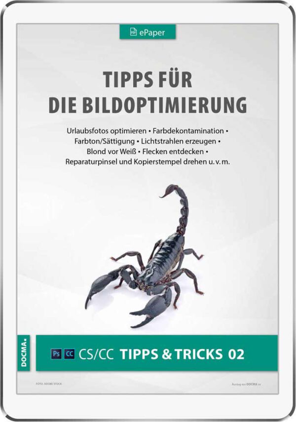 URLAUBSFOTOS OPTIMIEREN: Stapeloptimierung / Sonnenuntergang in Sekunden verstärken / Bildbeschnitt / Profilkorrektur nutzen / Details sichtbar machen / Horizont ausrichten / Farbstich schnell beseitigen. FARBDEKONTAMINATION: Ebenenstile nutzen / In „Auswählen und Maskieren“ dekontaminieren“ / Farbfehler wegmalen / Feinere Abstimmung / „Dekontaminations-Pinsel“. FARBTON/SÄTTIGUNG: Vorgaben / Generelles Ein- und Umfärben per Farbkreis / Farbbereiche / Farbbereich per Pipette anpassen / Zielgerichtet-anpassen-Werkzeug / Farbbereiche anpassenFarbbereiche verschieben. TIEFEN/LICHTER: Nicht-destruktiver Einsatz / Erweiterter Dialog / Vor-Optimierung im Raw-Konverter / Die Funktionsweise von Radius und Tonbreite / Farbe und Mittelton / Settings speichern / Schwarz/Lichter beschneiden. FREISTELLEN: Hintergrundradierer / Chromakey / Blond vor Weiß / Pinselwerkzeug (Sandfontäne) / Pseudo-Freistellen / Ebenenstil: Fülloptionen / Kanäle checken / Grau inklusive kanten entfernen. LICHTSTRAHLEN: Lichtstrahlen erzeugen. KANÄLE: Mitteltonmaske / Bildbearbeitung mit Luminanzmaske / Eine HSB/HSL-Sättigungsmaske anlegen / Auswahl per Farbkanal / Freistellen mit Kanalberechnung / Volltonfarbe anlegen. WEITERE TIPPS: Sanftes Schimmern / Halos aus HDR-Bildern entfernen / Während der Auswahl zwischen Lasso und Polygon-Lasso wechseln / Der Weg zur verlässlichen Druckgrößenvorschau / Reparaturpinsel und Kopierstempel drehen / Flecken entdecken / Lab-Schärfen im RGB-Farbraum / Überstrahlung hinzufügen / Looks über Ebenenmodi.