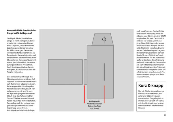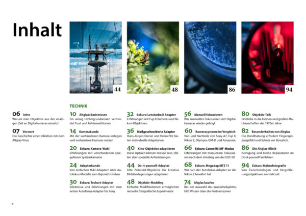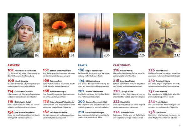 Aus gutem Grund ist das Interesse an alten, manuell fokussierenden Objektiven seit Jahren ungebrochen. Denn Vintage Objektive aus vordigitaler Zeit entwickeln an modernen Digitalkameras oft einen ganz individuellen Charme. Dieses Buch liegt nun in der 7. Auflage vor und kann inzwischen als Klassiker für die Vintage-Objektiv-Fotografie bezeichnet werden. Dabei findet man die alten Objektive schon für ein Taschengeld auf analogen und digitalen Flohmärkten. Aber es ist nicht alles Gold was glänzt. Das Buch bietet neben Praxistipps und Hintergrundwissen auch viele kreative Anregungen für eigene Projekte.
