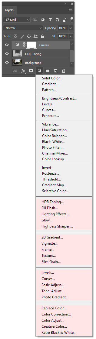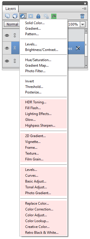 Zu den neuen Filtern, Füll- und Einstellungsebenen gehören unter anderem 2D-Farbverlauf, Glätten, Auto-Sättigung, Grundanpassung, Farbanpassung, Farbkorrektur, Kreatives Färben, Aufhellblitz, Filmkörnung, Rahmen, Glühen, Hochpass-Schärfen, Mikro-Kontrast, Fotoverlauf, Retro-Schwarzweiß, Textur, Tonanpassung und Vignette. AdjustShop bietet auch spezielle eigene Versionen bekannter Funktionen wie Klarheit, Kurven, Color Lookup Tabelle exportieren, HDR-Tonung, Tonwertkorrektur, Beleuchtungseffekte, Gleiche Farbe und Farbe ersetzen. Diese sollen mehr Möglichkeiten bieten, ein besseres Ergebnis erzielen oder mehr Vorgaben als die gleichen Funktionen in Photoshop (Elements) enthalten.