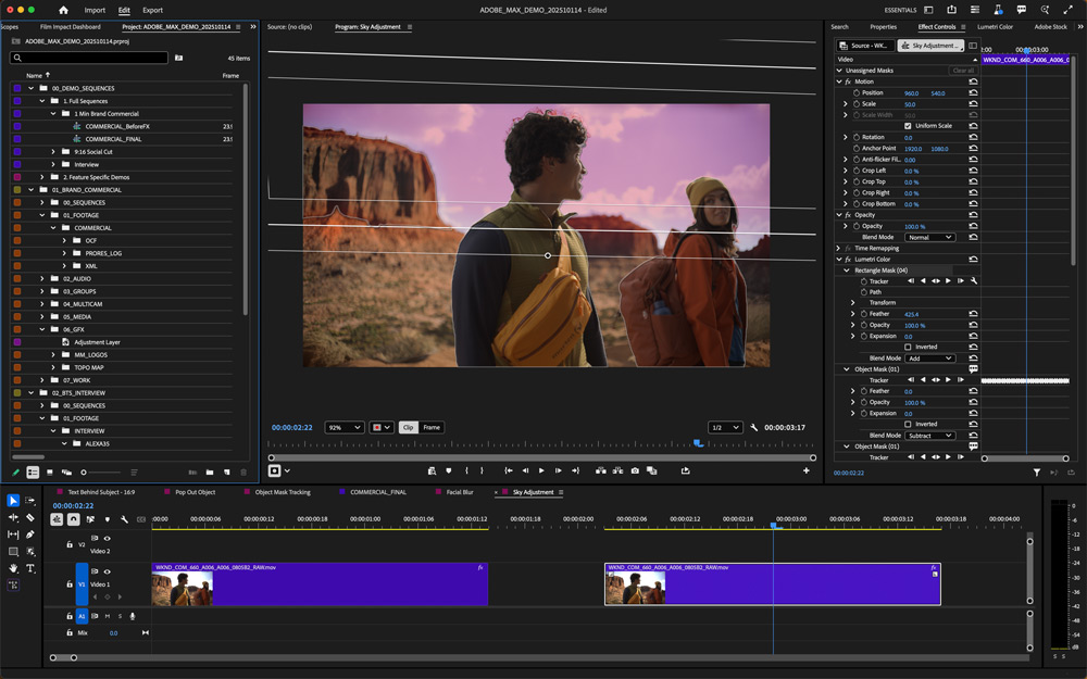 Im Mittelpunkt der Premiere-Updates steht die „Object Mask“: Mit dieser Funktion lassen sich bewegte Objekte oder Personen im Video präzise maskieren, indem der Anwender einfach mit der Maus über das gewünschte Motiv fährt und klickt. Farbige Überlagerungen helfen dabei, die Maske im Bild zu kontrollieren. Die Masken können flexibel angepasst, erweitert oder verkleinert werden – etwa, um das Gesicht einer Schauspielerin weichzuzeichnen oder einen Hintergrund schnell zu isolieren. Laut Adobe läuft die Maskenerkennung jetzt komplett auf dem lokalen Rechner; dabei kommt ein neues KI-Modell zum Einsatz, das keine Kundendaten für das Training verwendet.