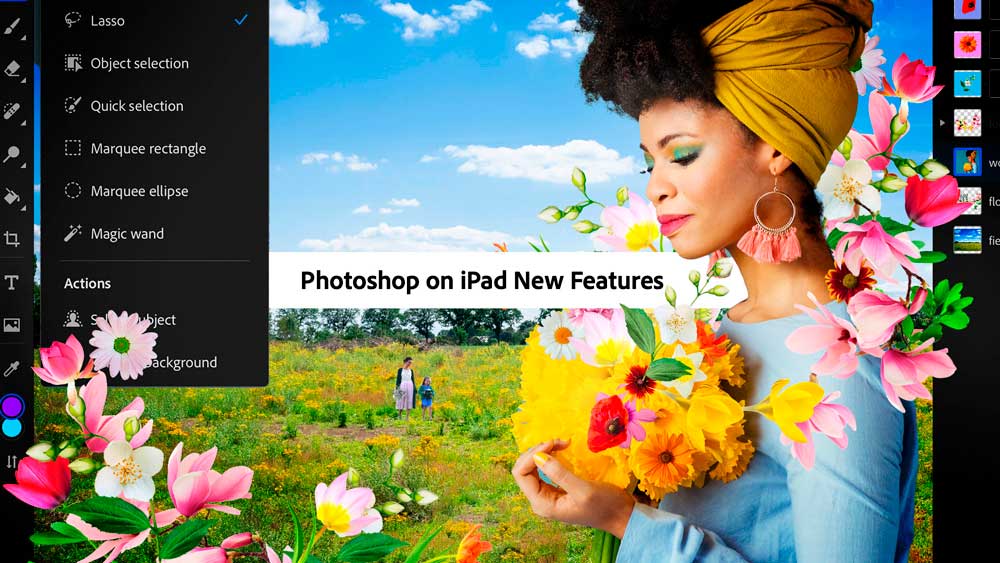 Neu in Photoshop auf dem iPad sind die Funktionen „Inhaltsbasierte Füllung“, „Hintergrund entfernen“ und „Objektauswahl für Haare und Personen“. Die Funktion Inhaltsbasierte Füllung lässt sich mit dem Lasso-Werkzeug oder einem der intelligenten KI-gestützten Auswahlwerkzeuge, etwa der Objektauswahl, nutzen, um störende Objekte im Bild zu entfernen. Ähnlich lässt sich auch der Hintergrund in einem Bild entfernen oder durch einen neuen ersetzen.