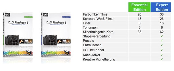DxO FilmPack 3 ist kompatibel mit Mac OS X ab 10.5 und Windows ab XP. Es ist in den Editionen „Essential“ und „Expert“ erhältlich, die sich in der Anzahl Filmprofile und im Funktionsumfang unterscheiden.