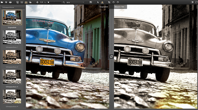 Das Werkzeugpanel wurde überarbeitet, um zu schnelleren Ergebnissen zu kommen. Neu ist auch eine Suchfunktion und die Möglichkeit, bevorzugte Looks zum schnelleren Zuweisen als Favoriten zu speichern. Mit der in der Expert Edition verfügbaren neuen Funktion „Schnappschüsse“ kann der Bearbeitungszustand eines Bildes jederzeit gesichert und wieder dahin zurückgekehrt werden.
