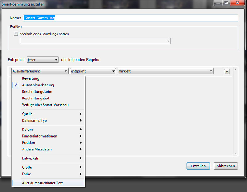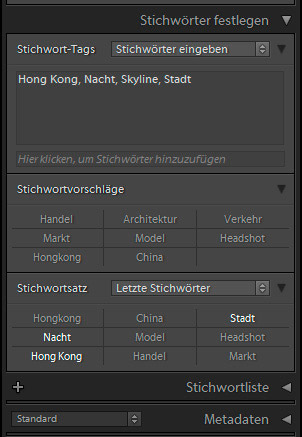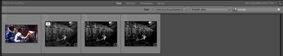 Von der halben Miete also noch ein paar Cent abgenommen. Aber wirklich sinnvoll wird das Ganze erst, wenn der Fotograf seine Bilder auch mit Stichworten verschlagwortet. Das Werkzeug dazu ist ganz prominent bei Lightroom platziert und dann können eben dem Strandbild die Stichworte Strand, Meer, Sonne und vielleicht noch Menschen zugewiesen werden. Denn danach kann Lightroom im Katalog suchen – und ganz schnell finden. Die entsprechenden Suchfelder sind standardmäßig am oberen Bildrand angelegt. Bei Metadaten bietet das Programm eine Liste der verfügbaren Möglichkeiten, die Textsuche kann auf bestimmte Felder beschränkt werden, mit der rechten Maustaste gibt es viele Optionen, so dass sich jeder Fotograf eine Suche für seine speziellen Bedürfnissen zusammenstellen kann. Noch ein großes Stück geschafft. Und vor allem müssen dafür nicht die Bilddateien umbenannt werden, wie man das vielleicht früher mal gemacht hat – und seitdem die Bilder Geburtstag1 bis Geburtstag113 auf der Festplatte hat. Aber noch ist das nicht alles.