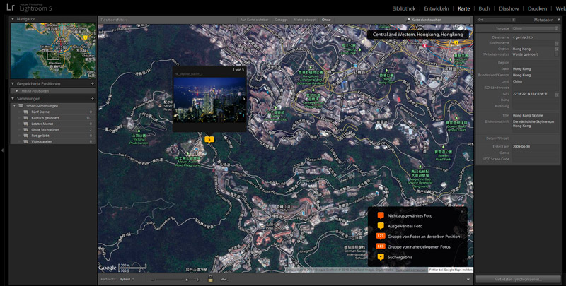 In Zeiten der digitalen Fotografie sind viele Bildinformationen bereits in Metadaten hinterlegt, also Belichtungzeit und Blende, Objektiv samt Brennweite, Kameramodell. Manchmal auch gleich die genauen Koordinaten. Lightroom kann all diese Daten auslesen und nach all diesen Daten suchen. Wer die entsprechenden GPS-Daten mitbringt oder seine Bilder hinterher auf einer Karte markiert, kann ganz bequem seine Reisebilder auf einer Landkarte anschauen und suchen. Dann muss man nur noch in etwa wissen, wo man denn gewesen ist.