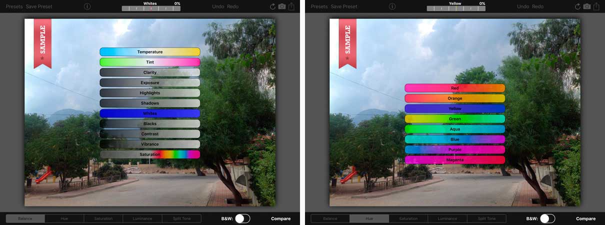 Wer bei seiner Bearbeitung nochmals das Original sehen will – und auch das ist ziemlich clever gelöst – hält einfach den Finger auf „Compare“. Dann wird das unbearbeitete Ursprungsbild eingeblendet. Zwar kann man sich nicht beide Bilder, also Original und bearbeitete Version, nebeneinander anzeigen lassen, dafür aber problemlos und schnell wechseln, so dass ein Vergleich durchaus möglich ist.