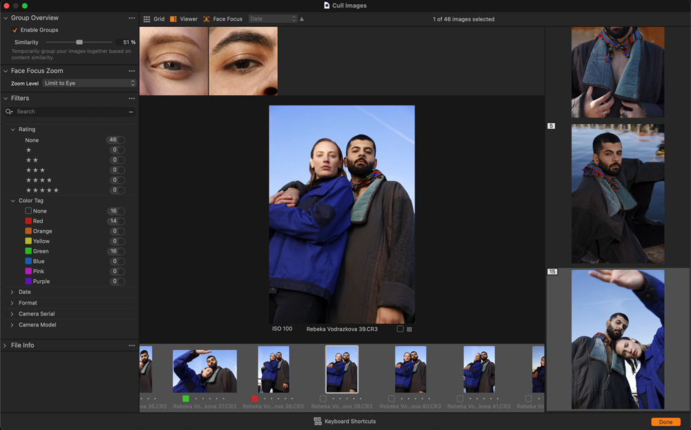 Beim Bildimport erkennt der neue Gesichtsfokus (Face Focus Zoom) das Gesicht einer Person und zeigt einen vergrößerten Ausschnitt des Gesichts an. Dabei stehen die Anzeigeoptionen 50 %, 100 %, 200 %, Begrenzung auf das Auge und Begrenzung auf das Gesicht zur Verfügung. Die zuletzt genannten beiden dynamischen Optionen stellen sicher, dass das gesamte Auge oder Gesicht in der vergrößerten Vorschau zu sehen sind, auch wenn diese Bereiche im Vergleich zur Auflösung groß sind.