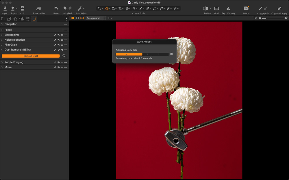 Das alte Fleckenentfernungs-Tool wurde überarbeitet und entfernt Sensorflecken automatisch mit KI-Unterstützung – derzeit noch im Beta-Stadium. Das Tool findet automatisch bis zu 200 Staubflecken und lässt sich sowohl für einzelne Bilder als auch für Bildstapel verwenden. Die endgültige Version soll bald ohne zusätzliche Kosten integriert werden.
