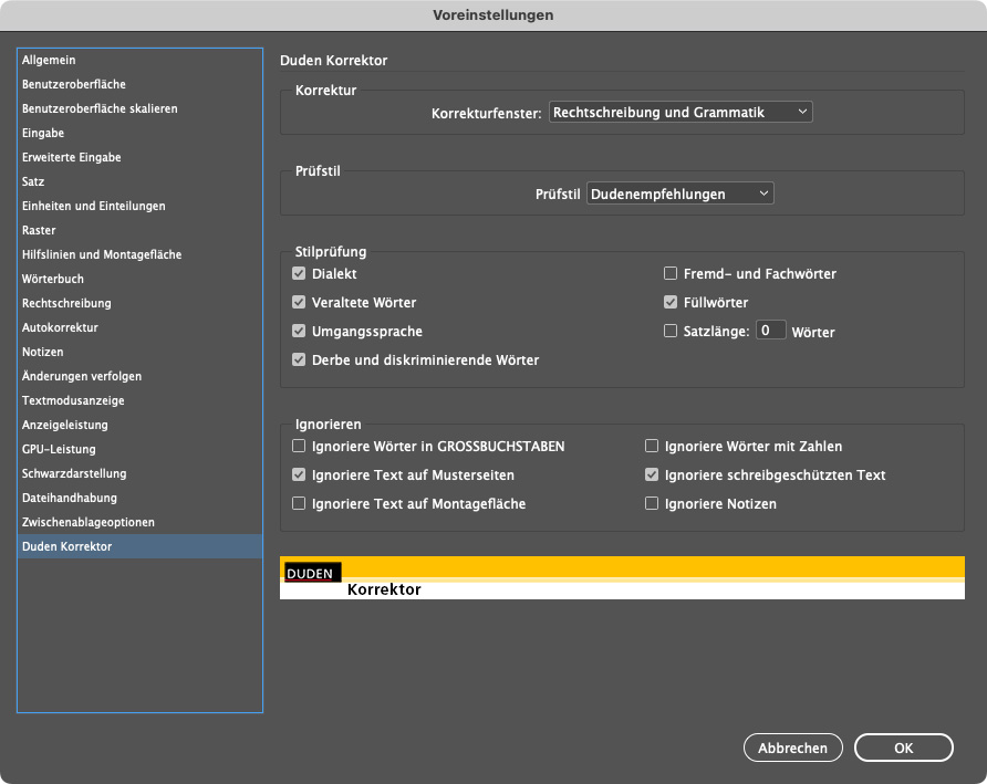 Was der Duden Korrektor alles bei der Rechtschreib- und Grammatikprüfung berücksichtigen soll, lässt sich in den InDesign-Voreinstellungen festlegen. Diese können sowohl über das Menü »InDesign > Voreinstellungen« als auch über das Menü »Duden > Optionen« angesteuert werden.