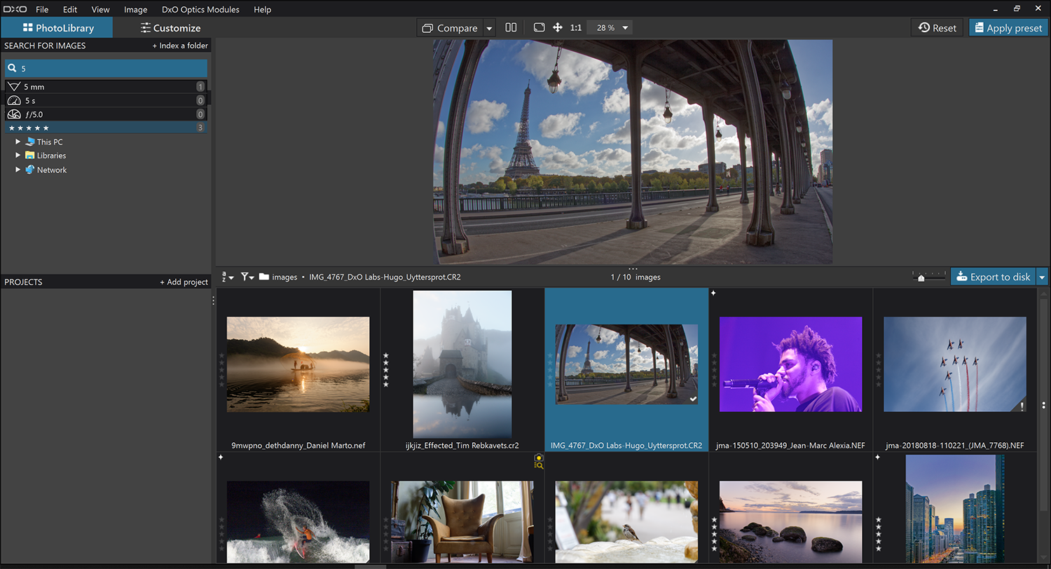 Die DxO Fotothek wartet mit neuen Funktionen für Suche, Auswahl, Sortierung und Anzeige von Bildern auf. Ein dynamisches Werkzeug für die Texteingabe vereinfacht die Suche, indem es von Anfang an bei der Texteingabe relevante Wörter anzeigt und passende Suchergebnisse auf der Basis vorhandener Dateinamen vorschlägt. Die Dateisuche kann anhand zahlreicher Kriterien erfolgen: Aufnahmeparameter (Blende, Belichtungszeit, ISO), Dateiname und Suffix, Aufnahmedatum sowie Anzahl im Rahmen der Bildbewertung vergebener Sterne. Die Suchergebnisse werden in einem neuen Raster von beweglichen und anpassbaren Miniaturansichten angezeigt.