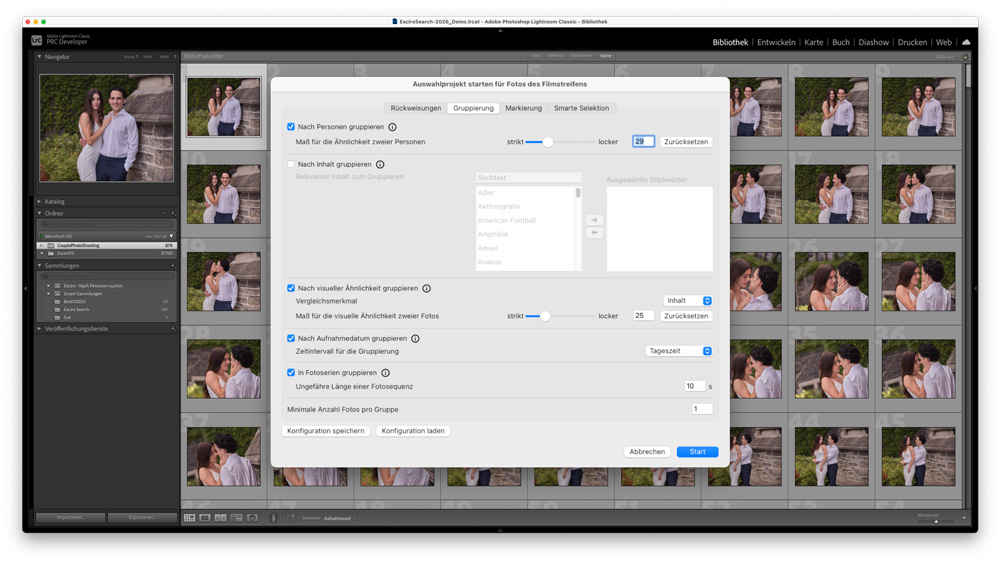 Mit dem neuen Werkzeug „Auswahlprojekte“ richtet sich Excire Search 2026 besonders an Fotografen, die aus vielen Bildern die besten Motive herausfiltern müssen. Die KI sortiert Fotos automatisch in Gruppen – zum Beispiel nach Personen, Ähnlichkeit, Aufnahmedatum oder Serien. Innerhalb dieser Gruppen lässt sich gezielt nach bestimmten Kriterien filtern. So kann etwa nach Schärfe, Lächeln, offenen Augen oder Ästhetik gesucht werden. Unscharfe oder falsch belichtete Bilder markiert die KI automatisch. Wer möchte, überlässt der Software sogar die komplette Vorauswahl. Eigene Vorgaben lassen sich dabei jederzeit individuell einstellen und die Auswahl bleibt nicht-destruktiv, das heißt, die Originaldateien bleiben erhalten.