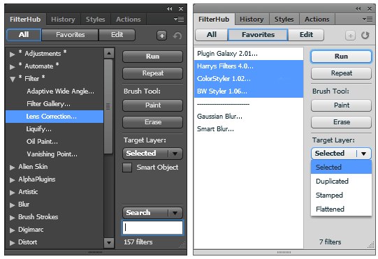 Darüber hinaus bietet FilterHub viele Funktionen, die das Filtermenü nicht zur Verfügung stellt. So kann man jederzeit den letzten Effekt eines jeden Filters (nicht nur des zuletzt verwendeten) anwenden, ohne dessen Dialog anzuzeigen, und Filtereffekte mit dem Pinselwerkzeug aufmalen oder entfernen. Des weiteren startet FilterHub mit einem Klick mehrere Filter hintereinander (aus der Favoritenliste), wendet den selben Filtereffekt auf mehrfachen Ebenen an oder beides: FilterHub lässt mit einem Mausklick mehrere Filter über mehrere Ebenen laufen.