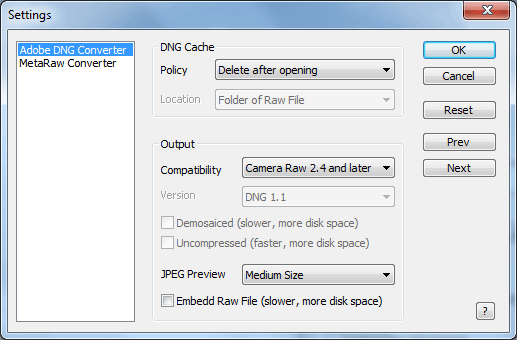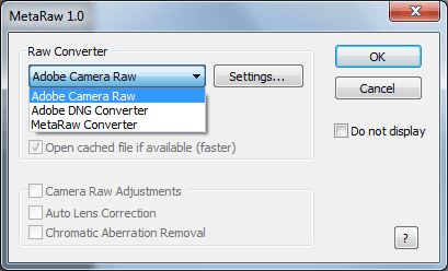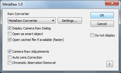 MetaRaw erlaubt es darüber hinaus, Rohdateien ohne den Camera-Raw-Dialog zu öffnen, was gelegentlich recht nützlich sein kann. Man kann auch Rohdateien als Smartobjekt öffnen, um später Camera-Raw-Einstellungen ohne erneutes Öffnen anzupassen. Für Archivierungszwecke ermöglicht es MetaRaw, während des Öffnens einer Rohdatei automatisch eine DNG- or TIFF-Datei zu speichern.