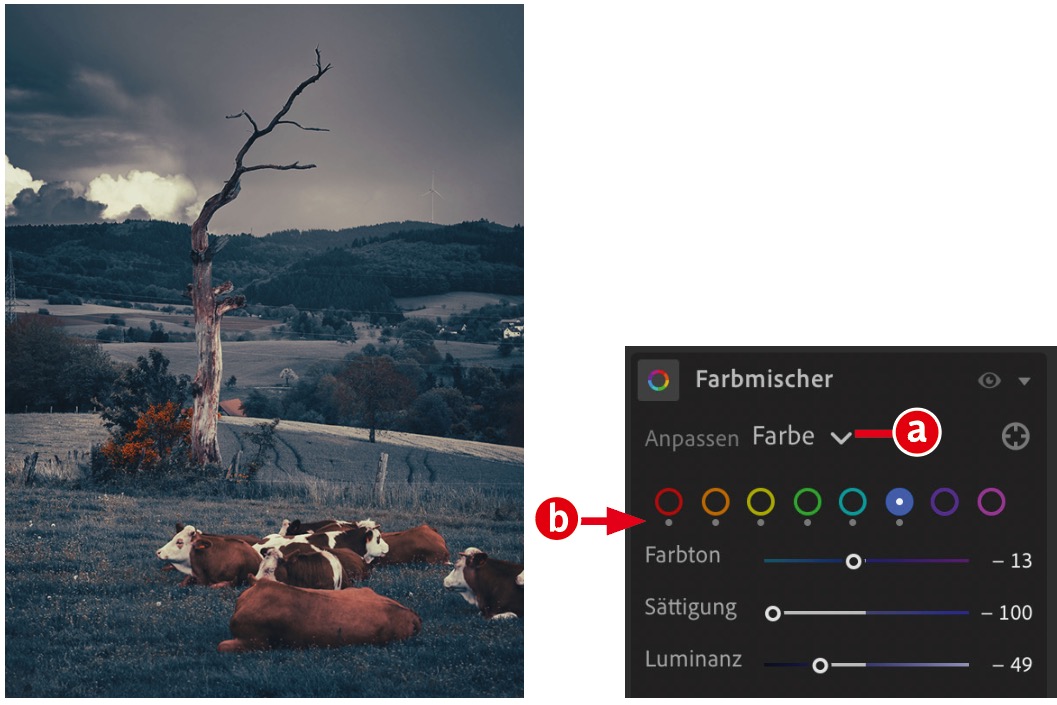 Dank kleiner grauer Punkte sehen Sie beim »Farbmischer« in Lightroom Classic sofort, in welchem Bereich Sie Änderungen vorgenommen haben. Im Modus »Farbe« (a) lassen sich die acht vorgegebenen Farbbereiche Bildschirmplatz sparend optimieren. Geänderte Bereiche werden durch einen grauen Punkt unterhalb des Farb-Symbols hervorgehoben (b), so dass man nicht jedes einzelne anklicken muss, um etwaige Veränderungen zu finden. Genau das sind übrigens praktische Kleinigkeiten, um die Power-User in Photoshop auch bei »Farbton/Sättigung«, »Farbbalance« und »Selektive Farbkorrektur« Adobe seit Jahrzehnten anflehen.