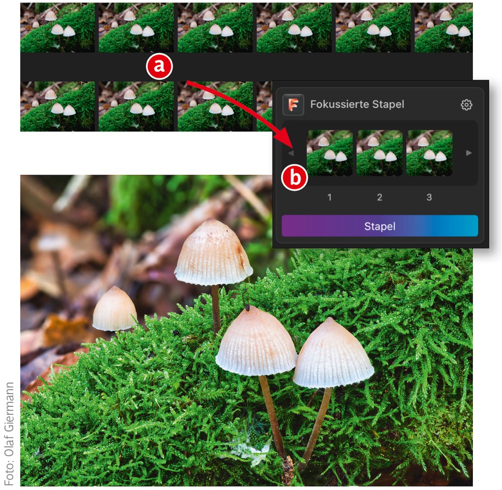 Durch Fokus-Stacking umschifft man vor allem das Problem der winzigen Schärfentiefe bei geringen Aufnahmeabständen – kann aber auch bei Landschaftsaufnahmen für durchgängige Schärfe innerhalb eines gewünschten Bereiches sorgen. In viele moderne Kameras ist bereits eine Aufnahmeserienfunktion mit Fokusverlagerung (Focus bracketing) integriert, mit der Sie automatisiert mehrere Fotos mit unterschiedlichen Fokusebenen aufnehmen können. Solch eine Serie (a) ziehen Sie im Katalog-Modul von Luminar Neo einfach auf die Oberfläche des »Fokussierte Stapel«-Plug-ins (b). Dieses setzt aus den jeweils schärfsten Stellen der Fotos ein neues Gesamtbild zusammen. Im Vergleich zu Affinity Photo 2 oder gar Photoshop 2023 liefert Luminar Neo beim Fokus-Stacking in meinen bisherigen Vergleichen insbesondere an problematischen Konturen deutlich bessere Ergebnisse, ohne dass man Fehler umfangreich manuell nachbearbeiten muss.