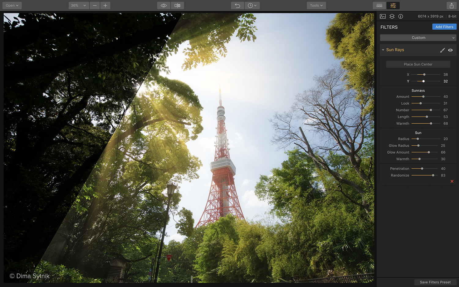 Anstatt die Menüs mit langweiligen Effekten und alter Technologie zu überfrachten, setzt Luminar nur auf Filter, die Fotografen auch wirklich wollen und benötigen. Luminar bietet zu diesem Zweck mehr als 40 Filter zur Farbkorrektur, um Details zu schärfen und der Kreativität freien Ausdruck zu verleihen. Durch die neuen Filter ergeben sich die Möglichkeiten, Farben mehr Brillanz zu verleihen, selektive Tonwertkorrekturen mittels Abwedeln & Nachbelichten vorzunehmen sowie die Beleuchtung eines Fotos mittels Sonnenstrahlen zu verändern.