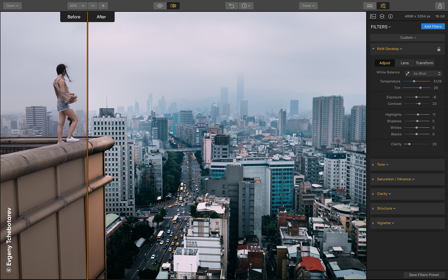 Luminar bietet eine neue RAW-Engine, die Bilder höchster Qualität noch schneller verarbeiten kann. Und es ist einfach, Kameraprobleme wie Vignettierung, Verzerrung und Farbsäume mit der Objektivkorrektur zu beheben. Falls es ungewollte, perspektivische Probleme mit dem Bild gibt, können die Funktionen Transformieren & Objektivkorrektur schnelle Abhilfe schaffen.