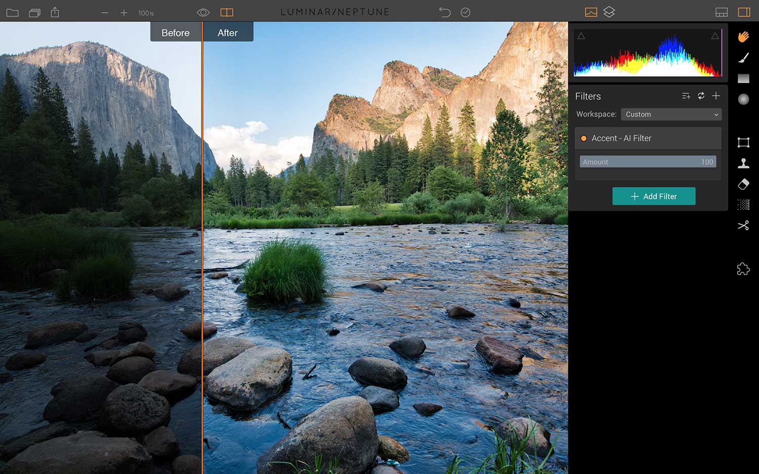Die bedeutendste Innovation in Luminar Neptune ist ein neuer Fotofilter, der mit einer eigens von Macphuns Forschungs- und Entwicklungsabteilung entwickelten künstlichen Intelligenz arbeitet. Der neue Accent AI Filter erlaubt es jedem Benutzer, atemberaubende Bilder mittels eines einzigen Reglers zu erstellen, anstatt dutzende Einstellungen einzeln vornehmen zu müssen. Es dauert nur eine Sekunde und bedarf nur des Verstellens eines Reglers, um ein Foto deutlich zu verbessern.