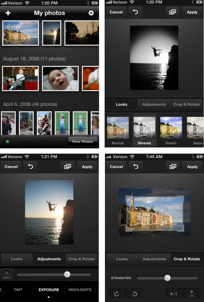 Revel nutzt dieselben Bildbearbeitungs-Technologien, die auch in Lightroom und Photoshop zum Einsatz kommen. Anwender können Helligkeit, Kontrast, Farben etc. sekundenschnell korrigieren oder alles mit nur einem Fingertipp der Automatik überlassen. Ganz gleich, wie sehr man seine Fotos bearbeitet – die Originale bleiben immer erhalten und lassen sich jederzeit rekonstruieren. Übrigens: Fotos, die mit dem iPhone oder iPad aufgenommen wurden, werden automatisch in Revel importiert. Selbstverständlich kann man diese Aufnahmen auch exportieren, zum Beispiel auf die Festplatte des Computers, um sie zu drucken.