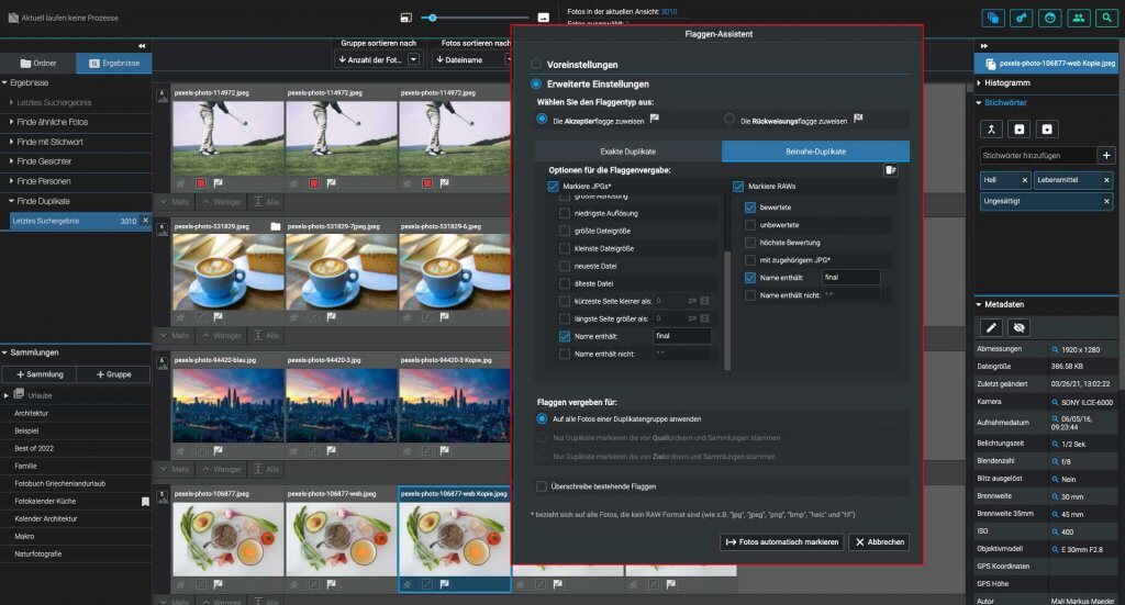 Darüber hinaus wurde der Duplikatefinder weiterentwickelt. Jetzt sind auch Dateinamen oder Teile davon als Kriterium für die automatische Markierung von Duplikaten mit der „Akzeptiert“- oder „Zurückgewiesen“-Flagge auswählbar. Damit ist es beispielsweise möglich, in einem Rutsch alle Duplikate, die im Dateinamen den Textteil „final“ oder „bearbeitet“ haben, als „Akzeptiert“ zu markieren.