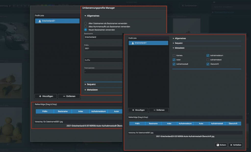 Die neuen „Umbenennungsprofile“ ermöglichen es, Profile mit benutzerdefinierten Dateinamen anzulegen, die sich mit einem Klick auf alle ausgewählten Bilder übertragen lassen. Dateinamen können außerdem automatisch aus Meta- oder IPTC-Daten wie Aufnahmestadt oder -land, Aufnahmedatum, Autor, Kameramodell oder Überschrift generiert werden. Dadurch können Fotografen ihre Bilder automatisiert mit aussagekräftigen Dateinamen versehen, die helfen, den Durchblick im Bildarchiv zu behalten.
