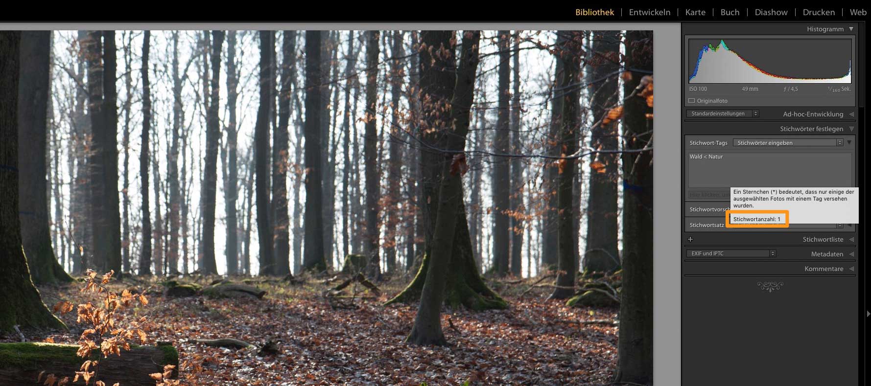 Stockfotografen müssen Fotos oft mit einer Mindestanzahl von Stichwörtern versehen. Die können sich nun über eine Anzeige der Anzahl der vergebenen Stichwörter freuen. Dass diese Zahl nur im Tool-Tipp erscheint, wenn man sich im „Stichwörter eingeben“-Modus befindet und dann den Cursor eine Zeit lang über dem Eingabefeld schweben lässt, finde ich persönlich etwas lahm, aber immerhin gibt es nun eine solche Anzeige.