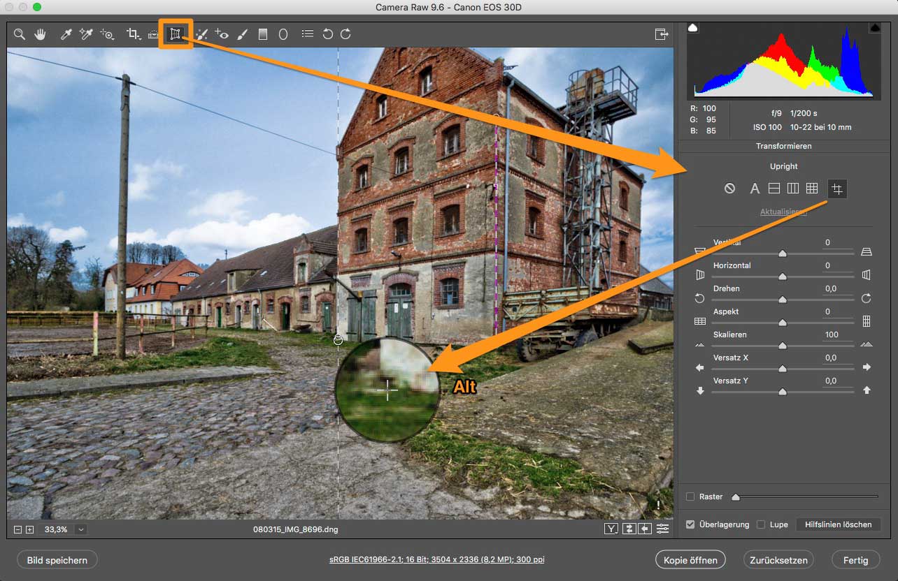 In beiden Tools können Sie Hilfslinien ins Bild zeichnen, mit denen Sie festlegen, welche Kanten im Bild exakt horizontal oder vertikal ausgerichtet werden sollen. Ziehen Sie dazu mindestens zwei, maximal vier Linien im Bild auf. Die Vorgehensweise erinnert an den Filter »Adaptive Weitwinkelkorrektur« in Photoshop – auch wenn Sie dort wesentlich mehr Möglichkeiten haben. Die Hilfslinien sollten Sie so genau wie möglich entlang der Kanten setzen: In Lightroom öffnet sich automatisch ein kleines Zoom-Hilfsfensterchen, in Camera Raw halten Sie die »Alt«-Taste gedrückt, um in der vergrößerten Vorschau Linien-Ende und -Anfang möglichst präzise zu setzen.