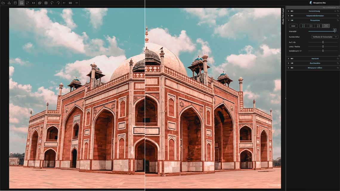 Eine weitere Neuerung der Nik Collection 3 ist das hinzugekommene Plug-in Perspektive Efex für geometrische Korrekturen. Mit dem 8. Plug-in der Bildbearbeitungssuite lassen sich Abbildungsfehler korrigieren und Effekte hinzufügen. Laut DxO ist es das einzige Tool mit einer automatischen Korrektur der Volumendeformation in den Randbereichen von Weitwinkelaufnahmen. Auch der Fischaugeneffekt oder ein schiefer Horizont werden automatisch korrigiert. Darüber hinaus kann das Tool auch kreativ eingesetzt werden, um die Verringerung der Schärfentiefe zu simulieren, also einen Miniatureffekt zu erzeugen.