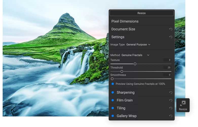 On1 Resize läuft als eigenständige Anwendung, kann aber auch als Plug-in mit Lightroom, Photoshop, Capture One, Affinity Photo, Apple Photos und Corel Paintshop Pro verwendet werden. In Photoshop lassen sich Ebenendateien mit Masken, Alphakanälen, Text und Anpassungsebenen in RGB sowie CMYK, Graustufen und LAB verarbeiten.