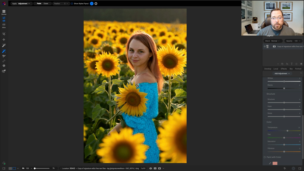 An erster Stelle nennt OnOne in einem Vorstellungsvideo zum Update das verbesserte Werkzeug Super Select AI. Beim Überfahren eines Bildes mit dem Werkzeug identifiziert es ein Objekt, durch einen Klick wird eine entsprechende Auswahl erzeugt. So lassen sich Bereiche wie Kleidung, Haare, Haut oder – wie im Screenshot einzelne Blumen – schnell auswählen und bearbeiten. Für Farbkorrekturen stehen verschiedene Schieberegler zur Verfügung. Ähnlich wie das Werkzeug Super Select AI bietet das auch aktualisierte AI-Werkzeug Quick Mask die Möglichkeit, Masken per Mausklick zu erzeugen.